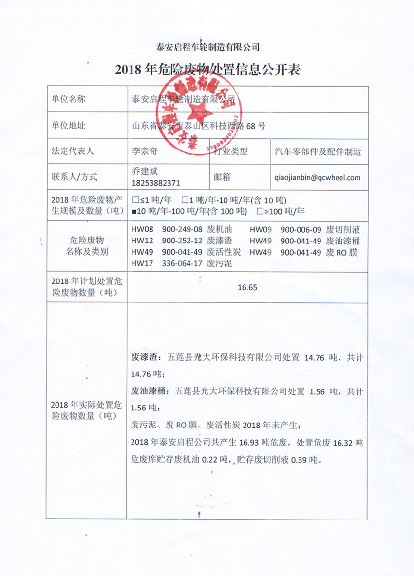 泰安啟程車輪制造有限公司危險(xiǎn)廢物處置信息公開