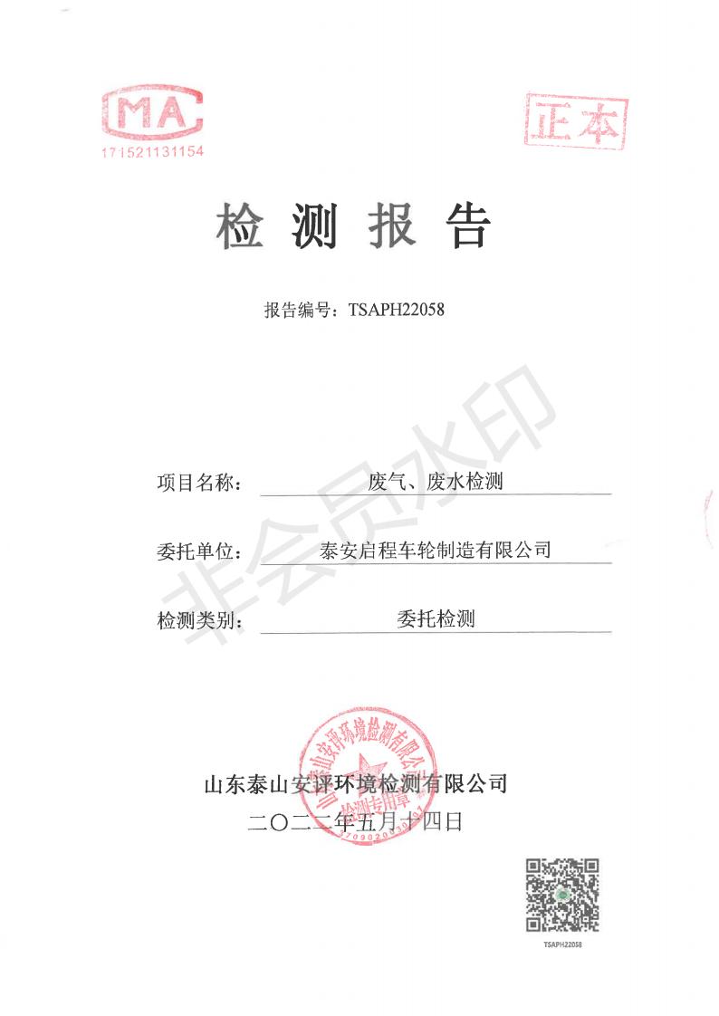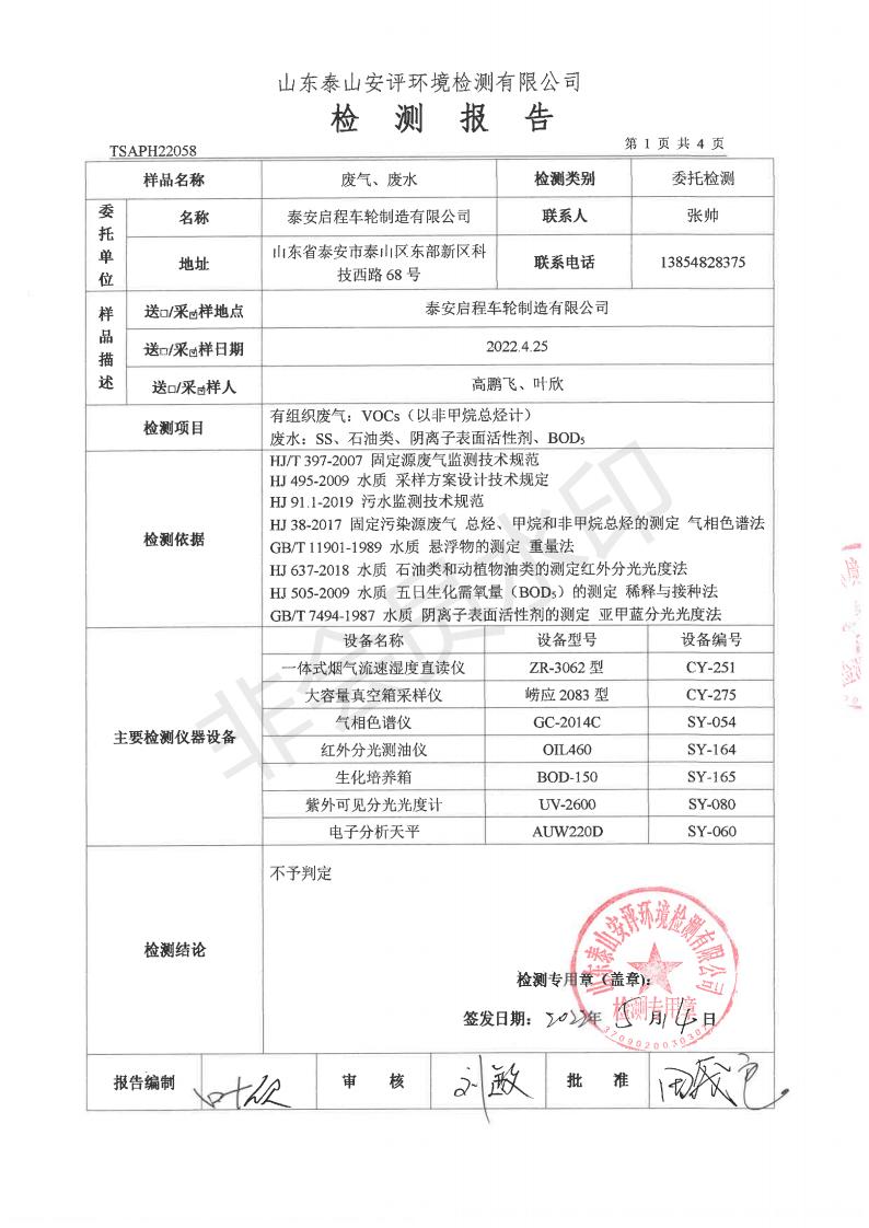 泰安啟程車輪制造有限公司2022年4月份環(huán)境污染物排放檢測報告