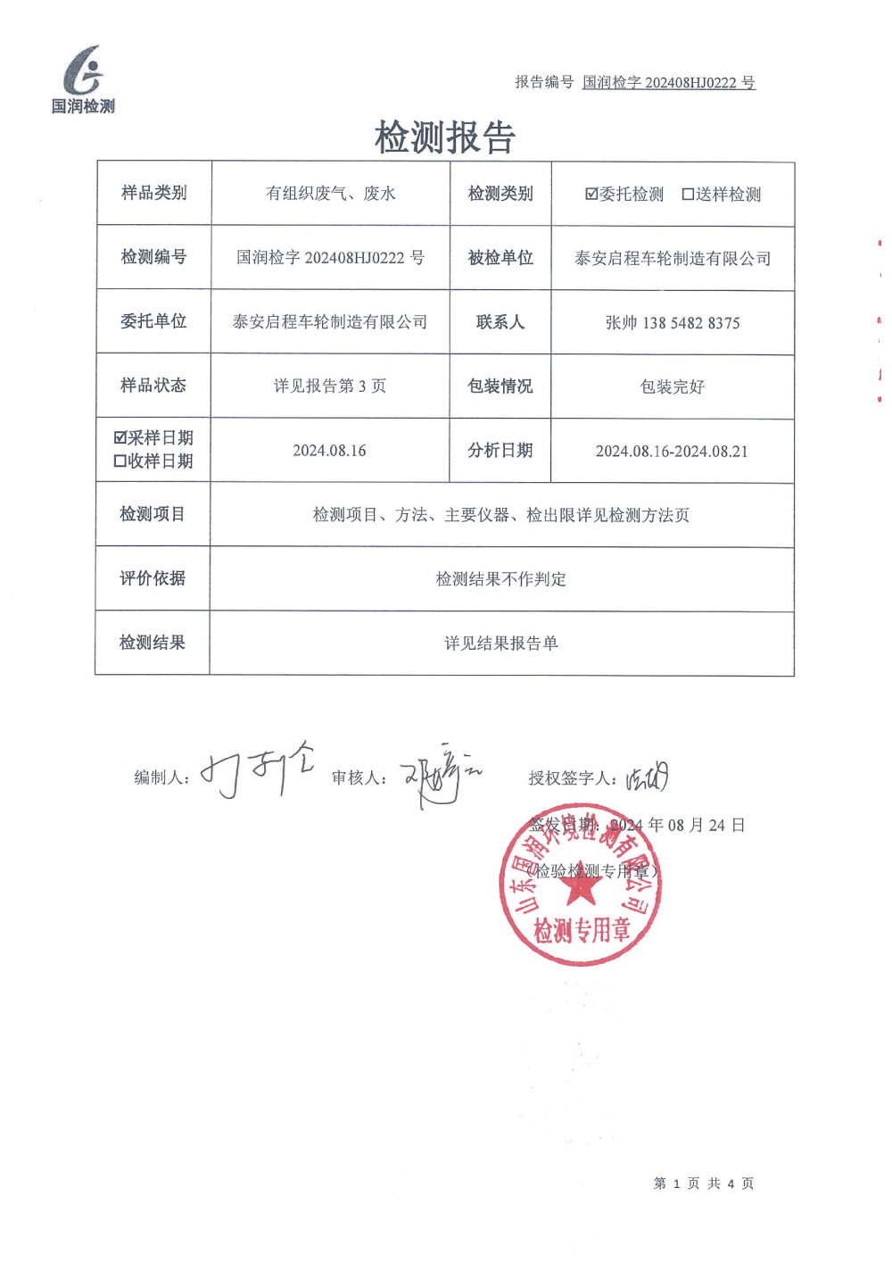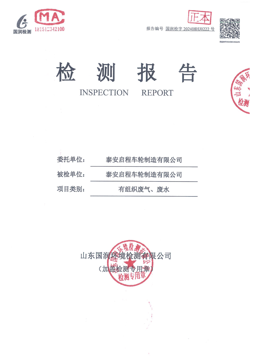 泰安啟程車輪制造有限公司2024年8月份環(huán)境污染物排放檢測報(bào)告