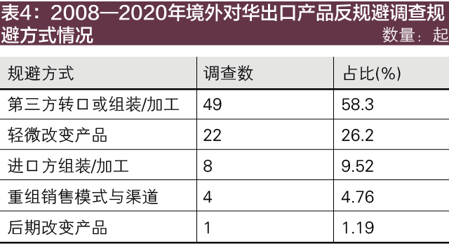 對(duì)我國(guó)出口產(chǎn)品發(fā)起的反規(guī)避調(diào)查主要涉及5種規(guī)避方式:進(jìn)口方組裝/加工規(guī)避、第三方轉(zhuǎn)口或組裝/加工規(guī)避、輕微改變產(chǎn)品后出口規(guī)避、后期改變產(chǎn)品規(guī)避、重組銷售模式和銷售渠道規(guī)避。