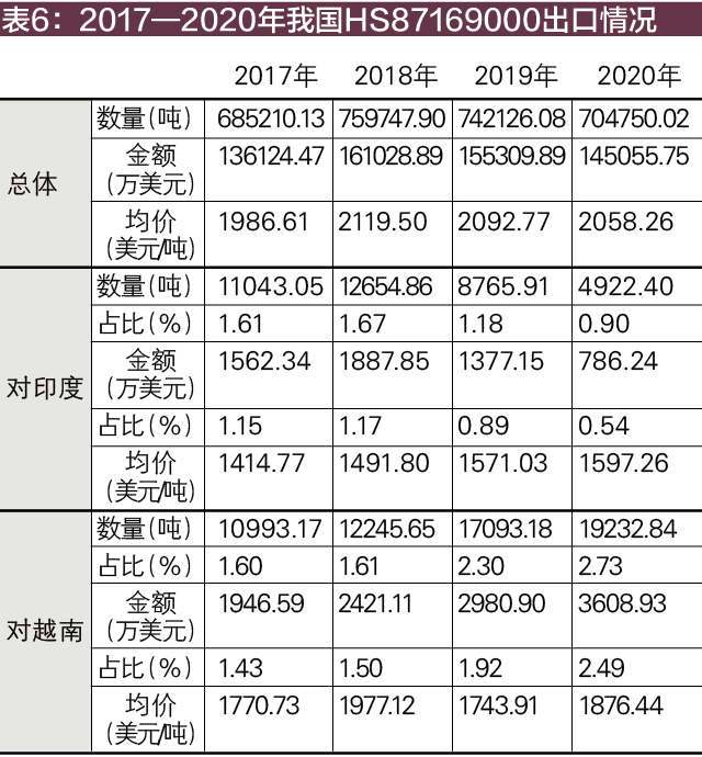 2017—2020年,我國(guó)HS87169000對(duì)印度出口均價(jià)還是顯著低于總體出口均價(jià),表明對(duì)印度出口涉案產(chǎn)品質(zhì)量和技術(shù)含量還有進(jìn)一步改進(jìn)的余地。