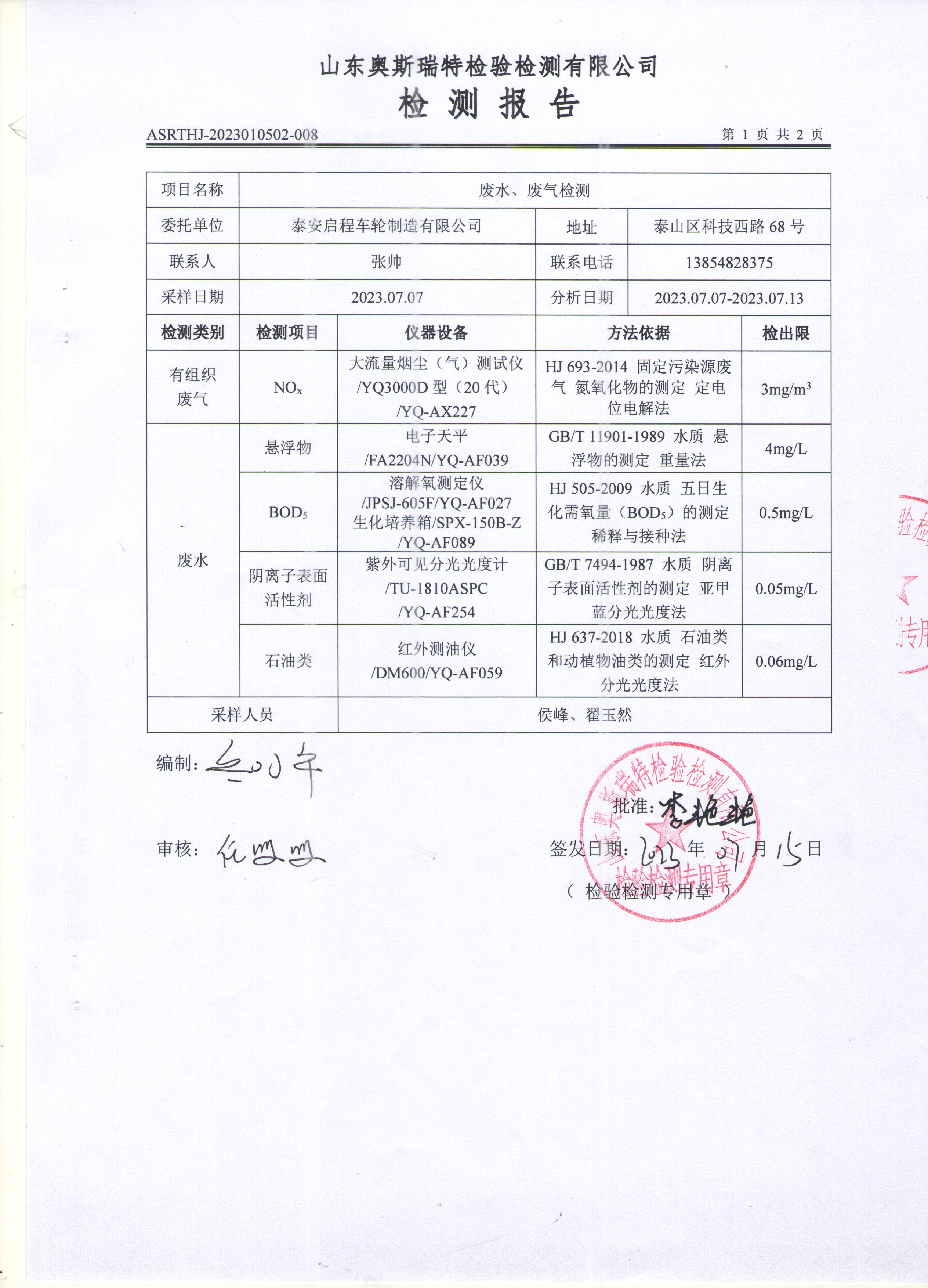 泰安啟程車輪制造有限公司2023年7月份環(huán)境污染物排放檢測(cè)報(bào)告