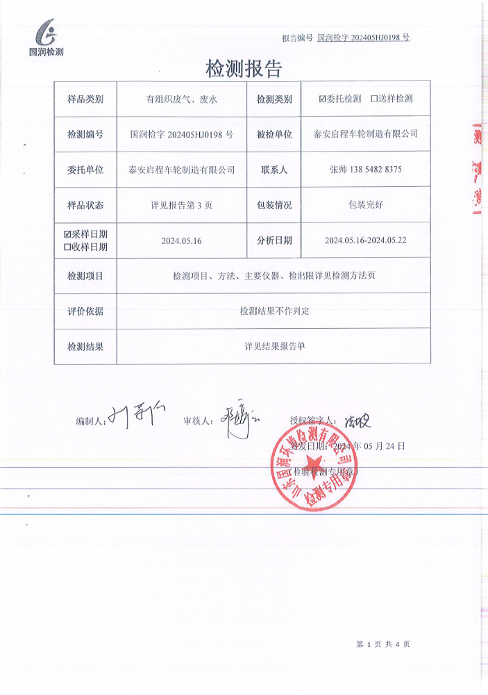 泰安啟程車輪制造有限公司2024年5月份環(huán)境污染物排放檢測報告