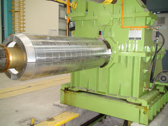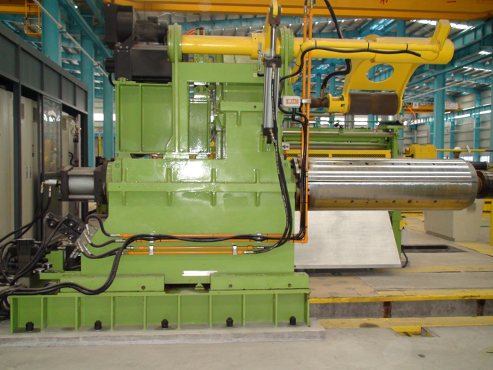 鋼卷內(nèi)徑:φ508 mm (脹縮范圍φ470mm~φ520mm),用交流矢量電機(jī)建立張力,輸出端裝有氣動(dòng)剎車器,起二級(jí)剎車保護(hù)作用。漲縮筒張緊固定卷料后,利用卷料打開裝置進(jìn)給卷料料頭,并利用電機(jī)建立開卷張力(自動(dòng)調(diào)整)與夾送輪及粗矯裝置形成穩(wěn)定張力開卷